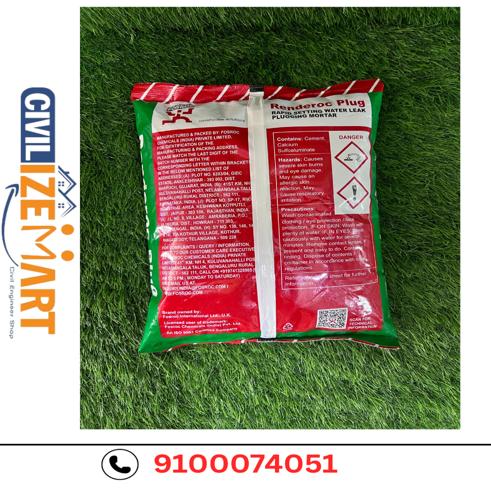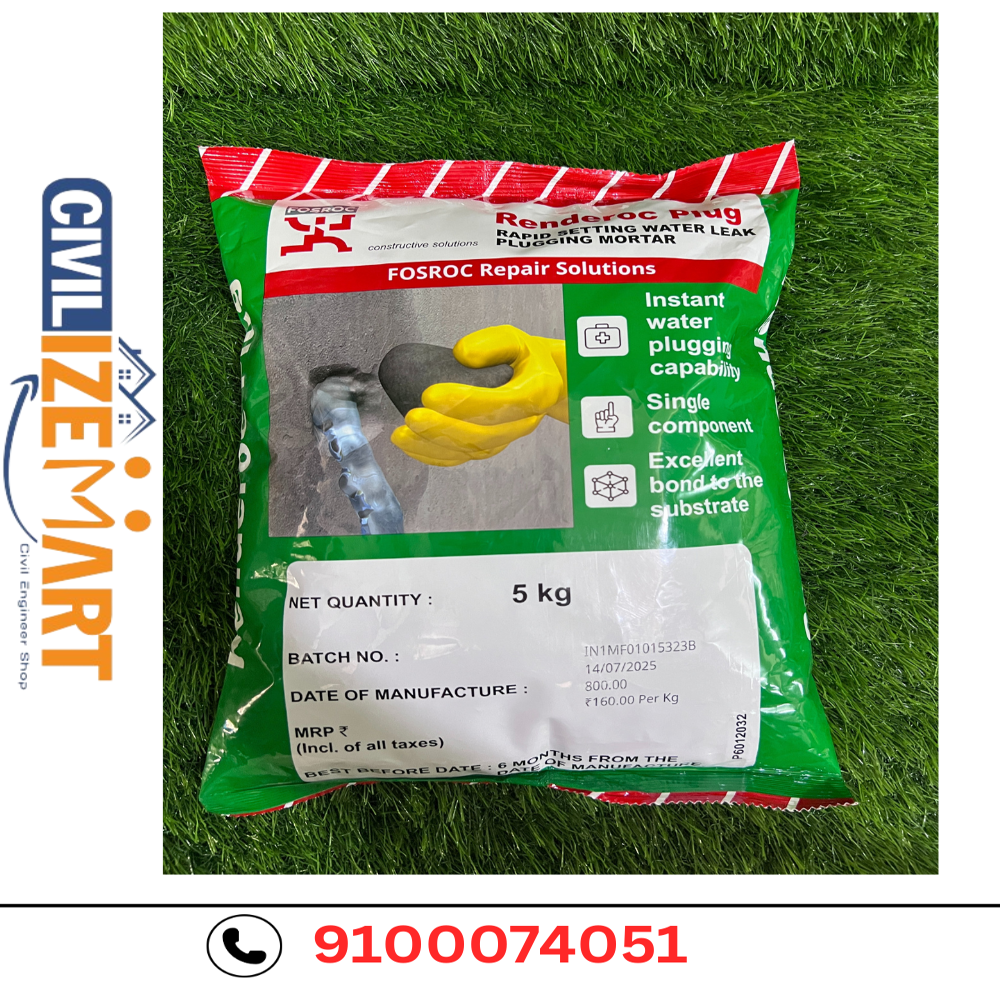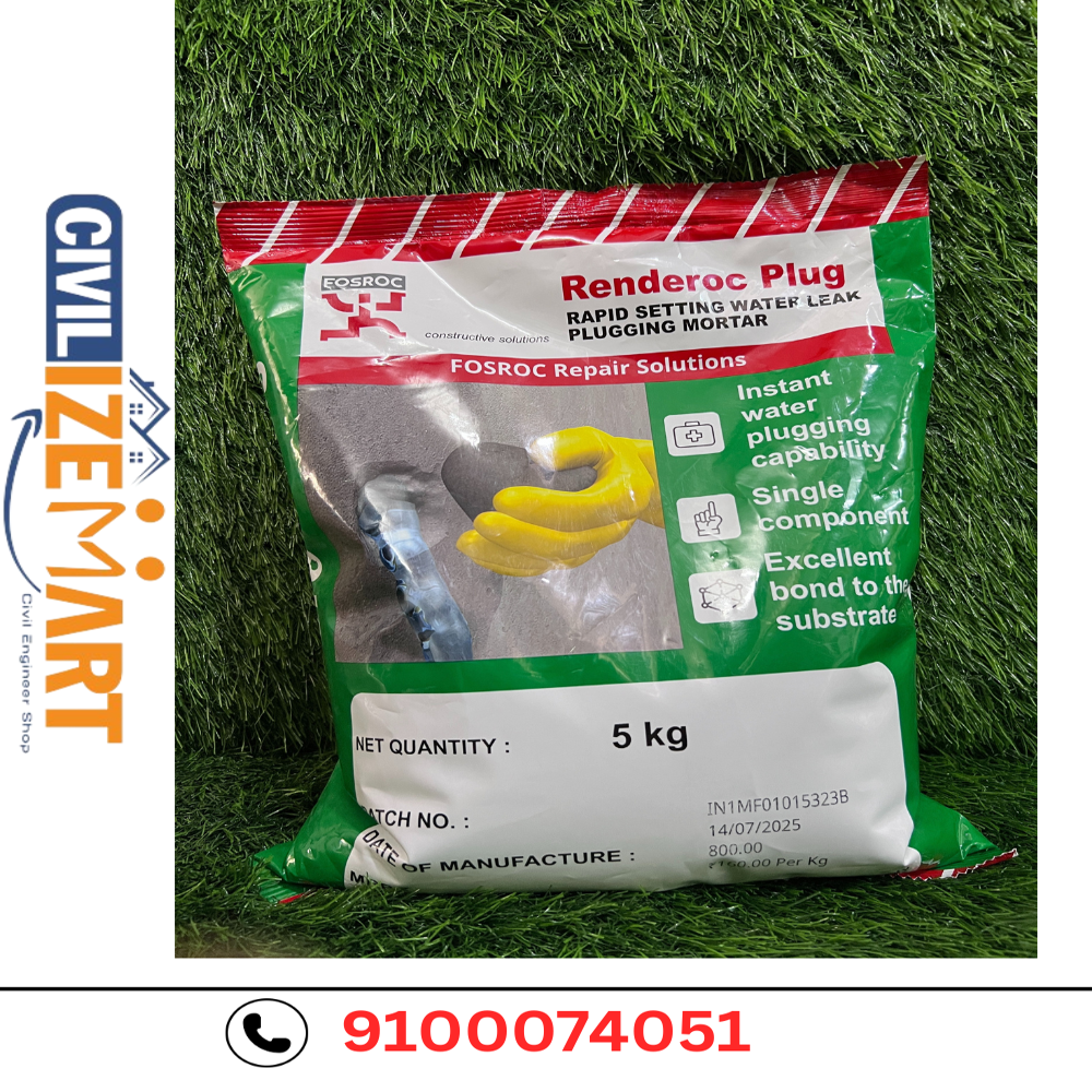 Fosroc Renderoc Plug is a rapid-setting, cement-based plugging mortar specially designed for stopping water leakages instantly in concrete and masonry structures. It forms a strong, durable, and watertight seal within minutes.